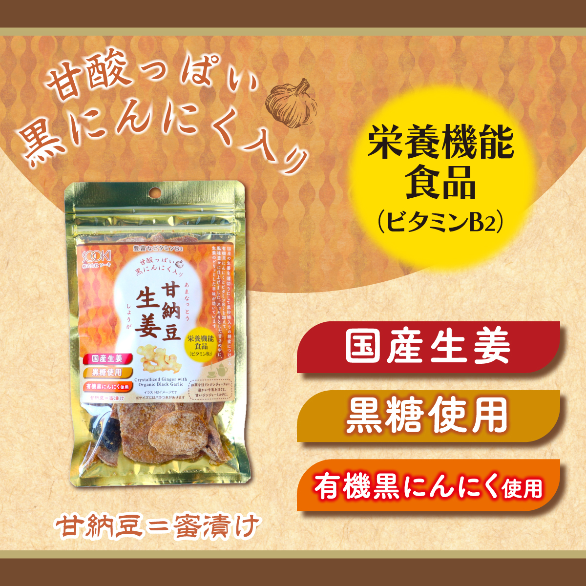 生姜(国産)、砂糖、加工黒糖、黒にんにく/ビタミンB2