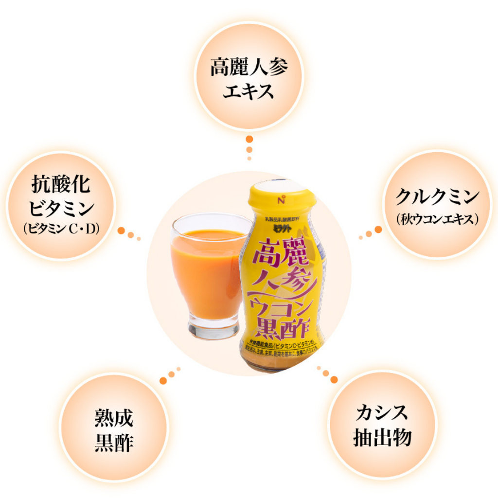 エネルギー(熱量) 36kcal/たんぱく質 0.7g/脂質 0.1g/炭水化物 8.5g/食塩相当量 0.03g/カルシウム 28mg/カリウム 36mg/ビタミンC 120mg/ビタミンE 8mg/リン 22mg/高麗人参エキス 150mg/カシス抽出物 65mg/ウコン抽出物